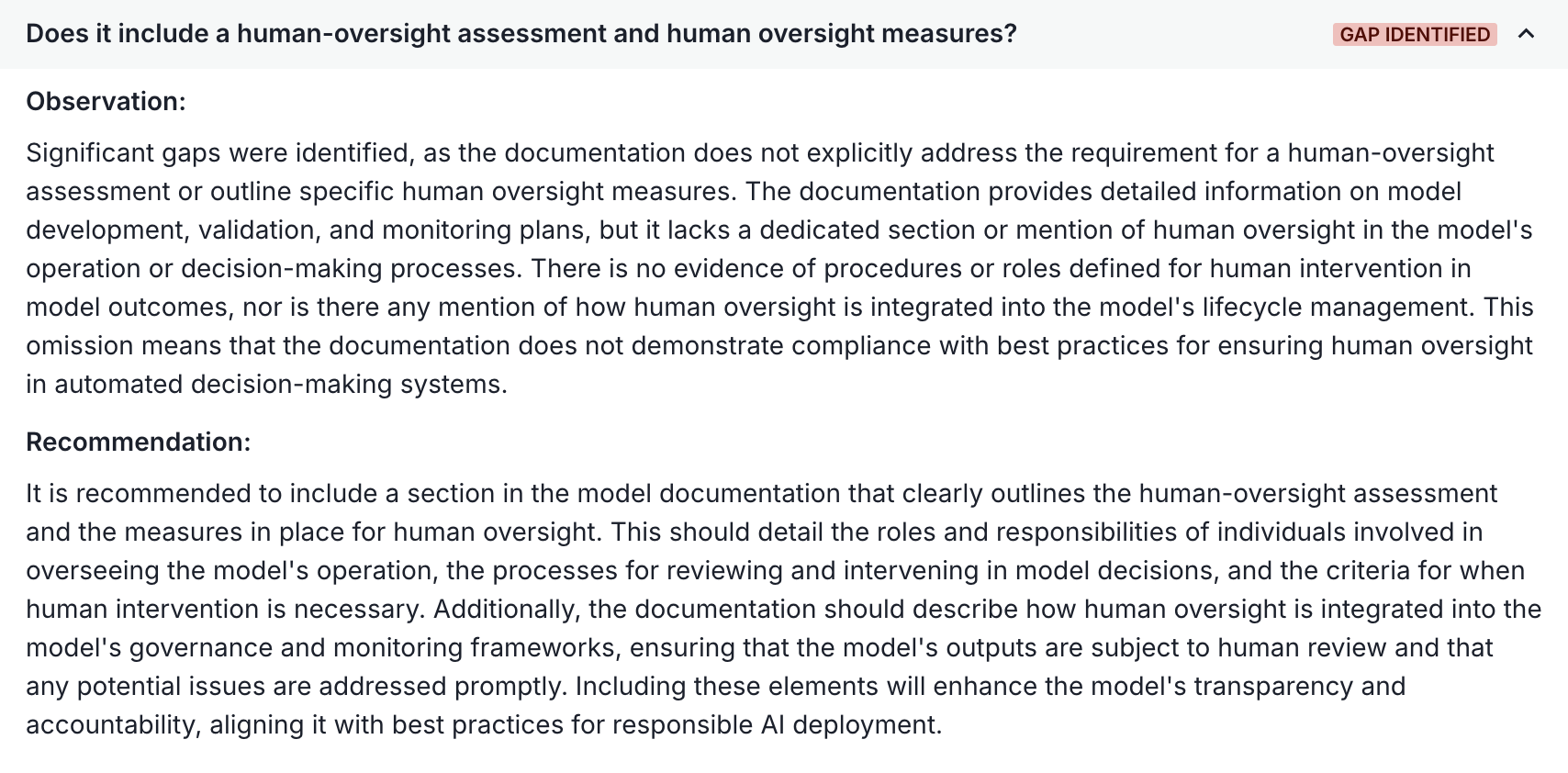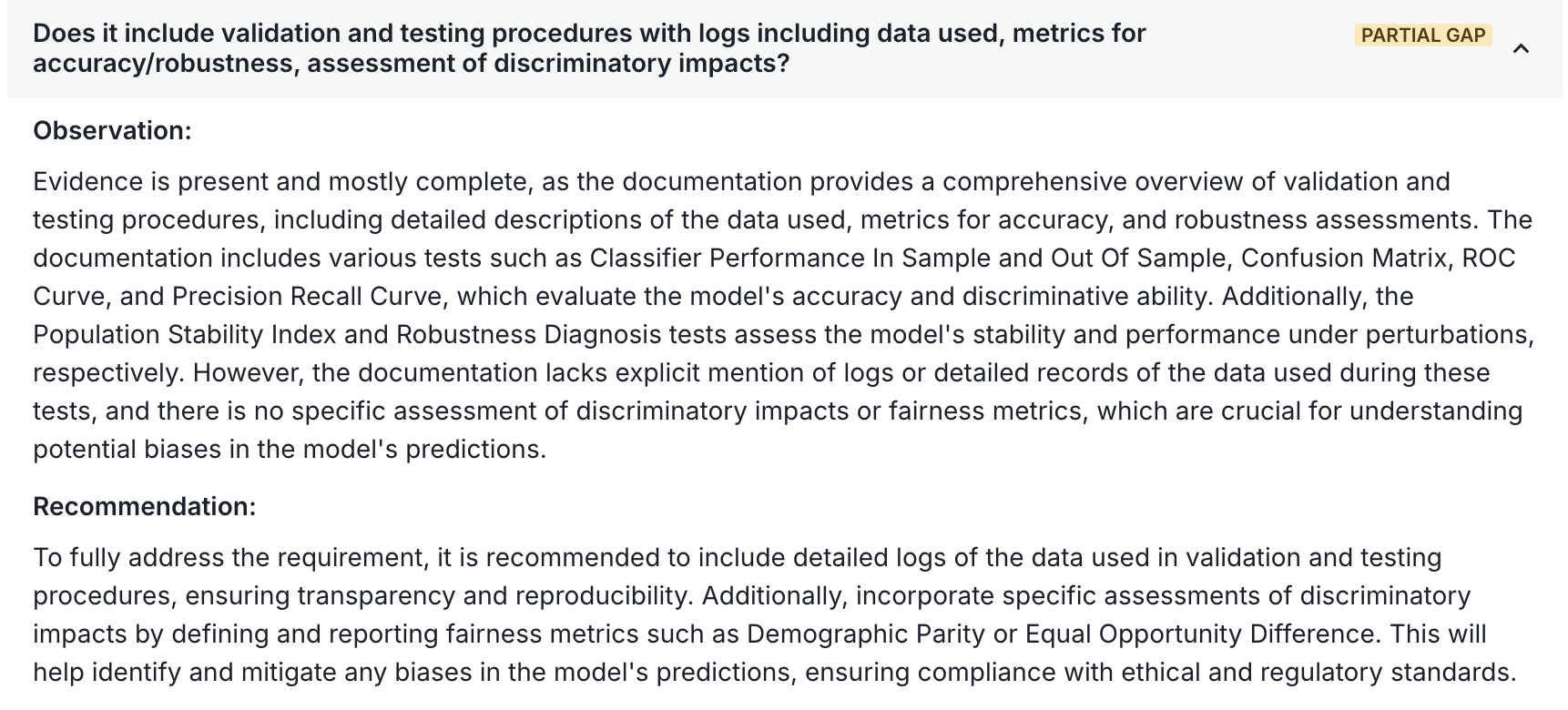 The Virtual Document Validator is a compliance tool that reviews model documentation against a selected regulatory standard. Use the Document Checker to identify gaps, generate actionable recommendations, and focus your efforts on areas that require attention. The Document Checker uses a structured checklist to: