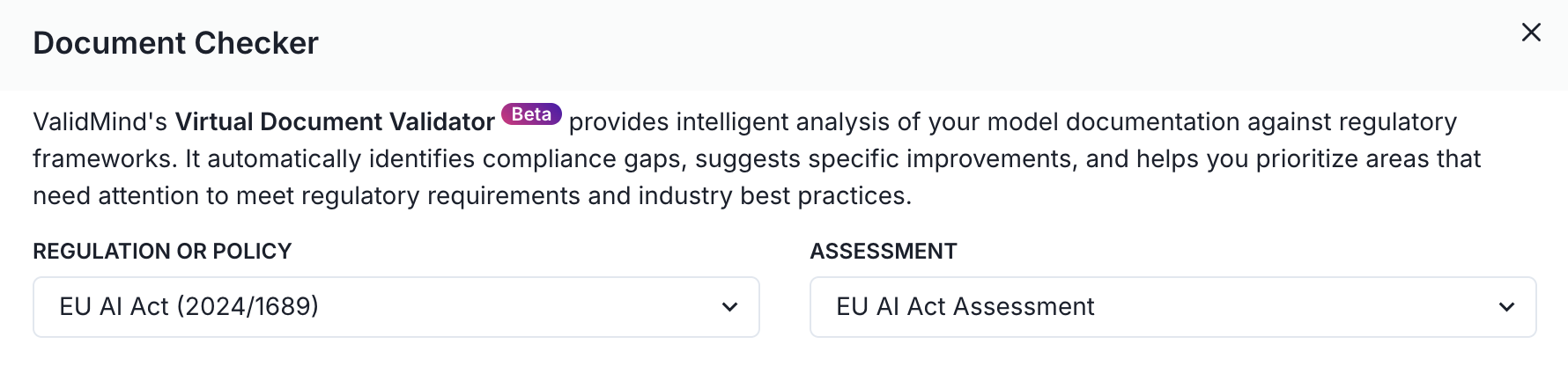 In the Document Checker modal, select a regulation and an associated assessment from the drop-down menus to to check your document against: