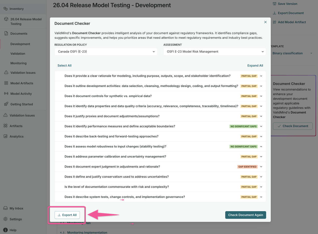 Create ValidMind templates from PDF documents, automatically map evidence in validation reports, generate evidence assessments, and export Document Checker results as a PDF report.