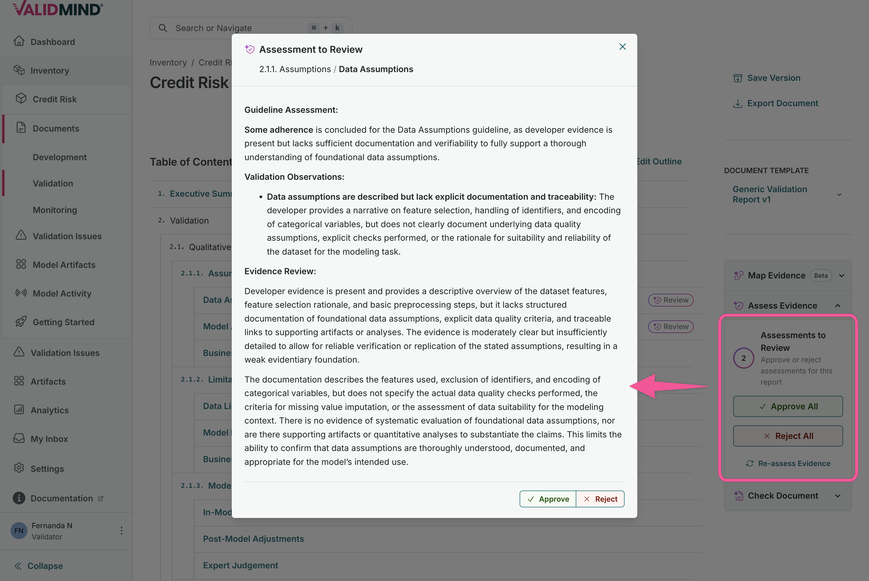 Once evidence is linked to your validation report sections, you can auto-generate assessments that: