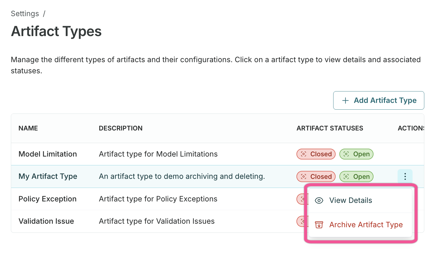 - Archive artifact types to hide them from new artifact creation. Existing artifacts of default types will be also be hidden from view.