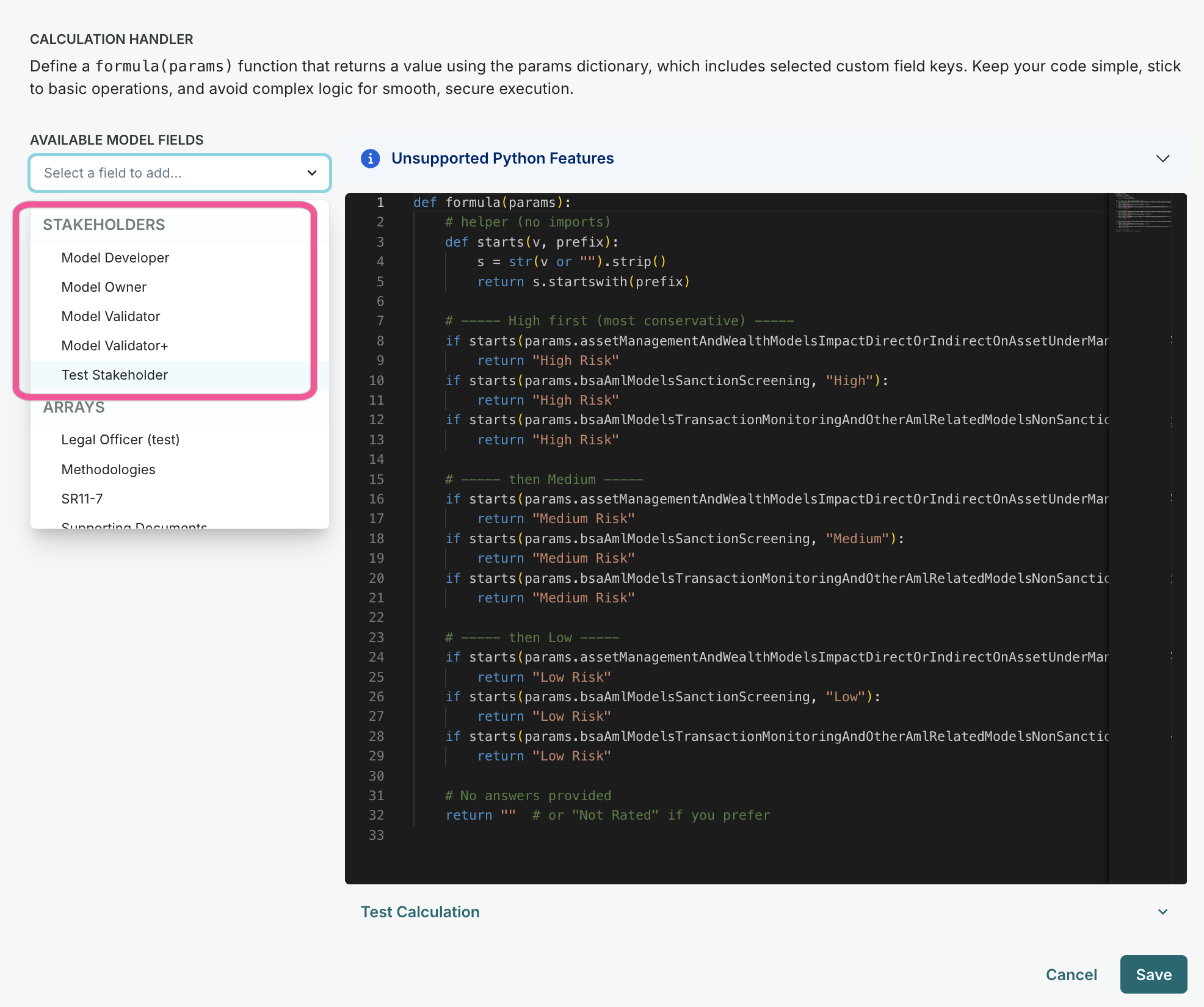 - Model stage: Use the current model stage value in calculations, enabling dynamic fields that update when models progress through lifecycle stages.