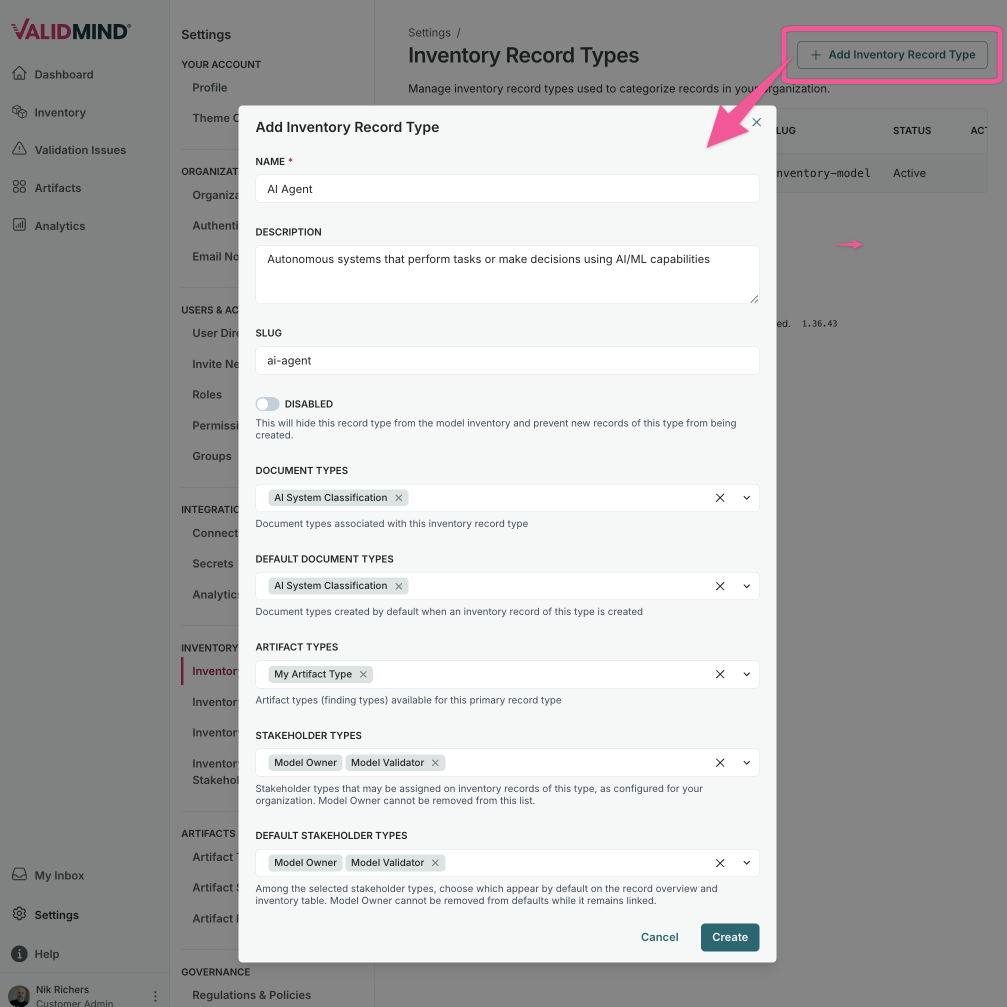 - Create custom record types for different governance needs like analytics models, attestations, or AI agents.