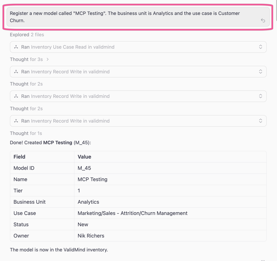 Connect AI assistants and developer tools to interact with the ValidMind Platform through text prompts via the Model Context Protocol (MCP):