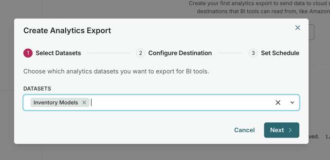 Create Analytics Export dialog showing dataset selection