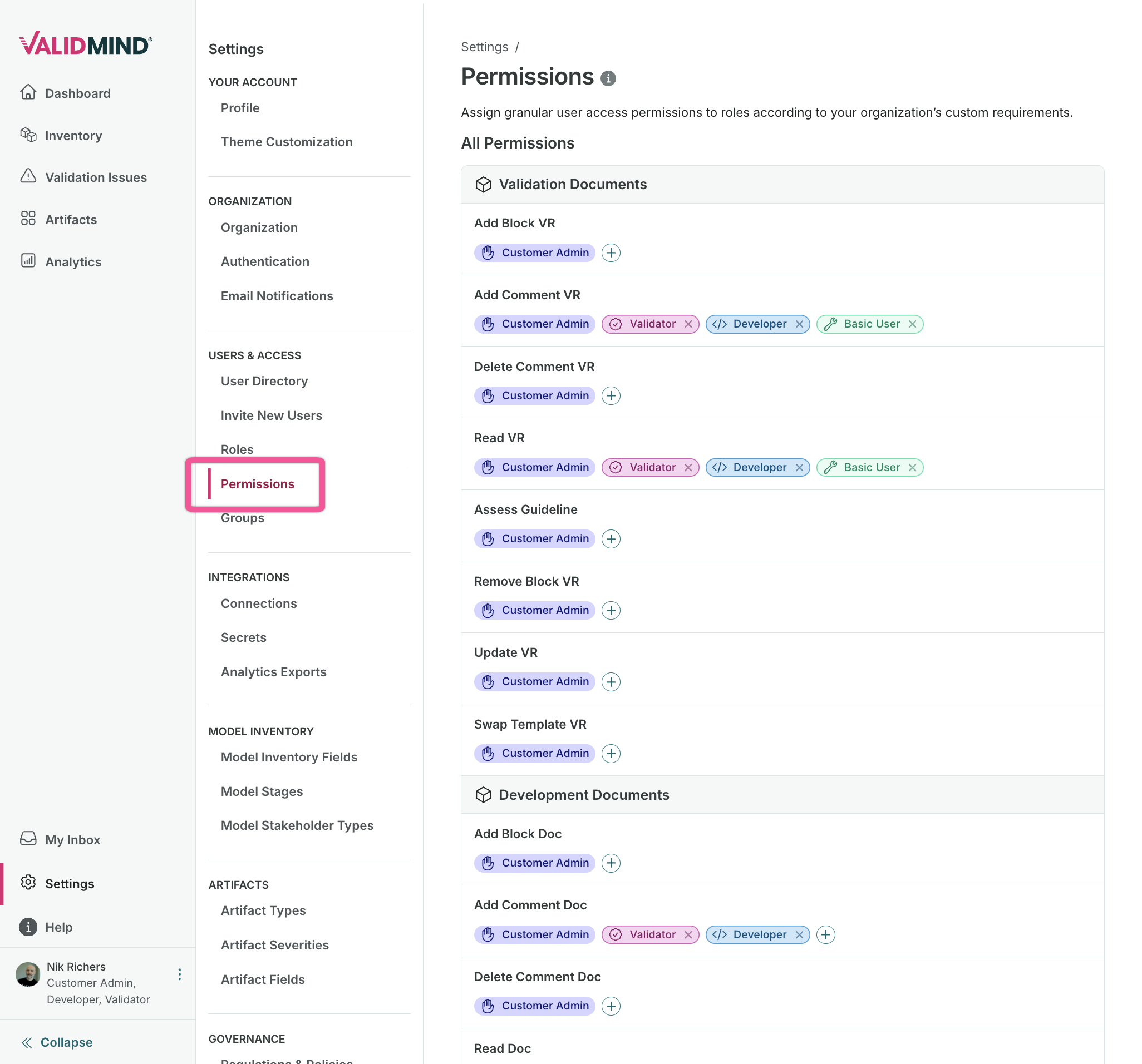 • Stakeholder permissions: Control access to model inventory fields, artifact fields, document types, and artifact types per stakeholder role. Search, filter, and bulk-edit permissions in a single view.